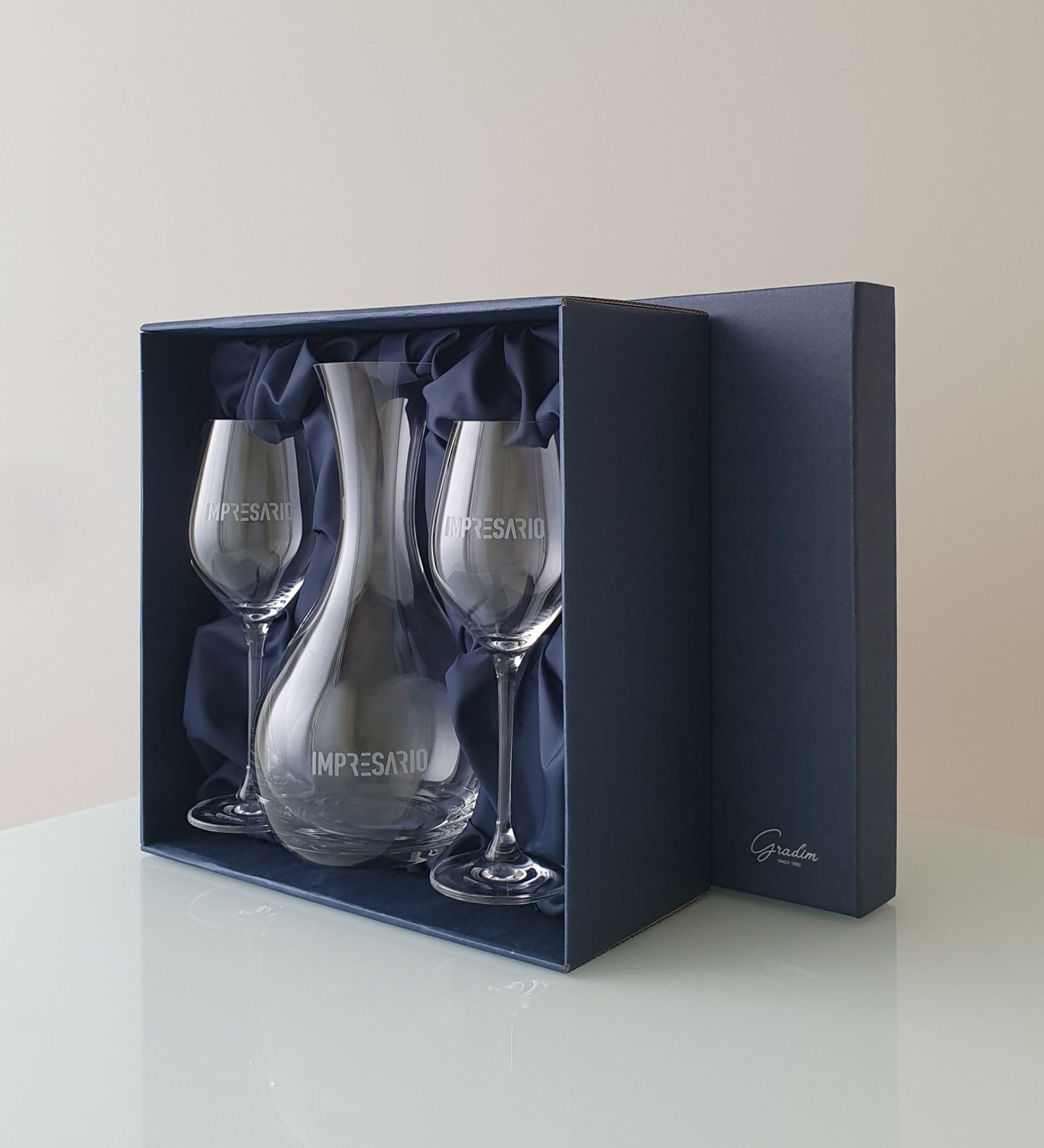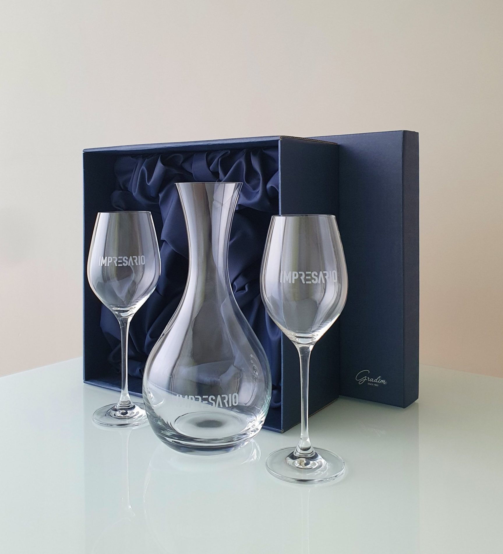 Firemní dárková saténová kazeta obsahuje karafu o objemu 1200 ml a 2 sklenice na víno o objemu 360 ml, které jsou gravírované diamantovou mikrobruskou. Cena je za 1 set včetně saténové dárkové kazety a platí při odběru od 30 ks. Možnost doobjednat z druhé strany věnování nebo pískování stopky. Pro možnost ověření dostupnosti zvoleného produktu zvolte způsob platby převodem na bankovní účet.