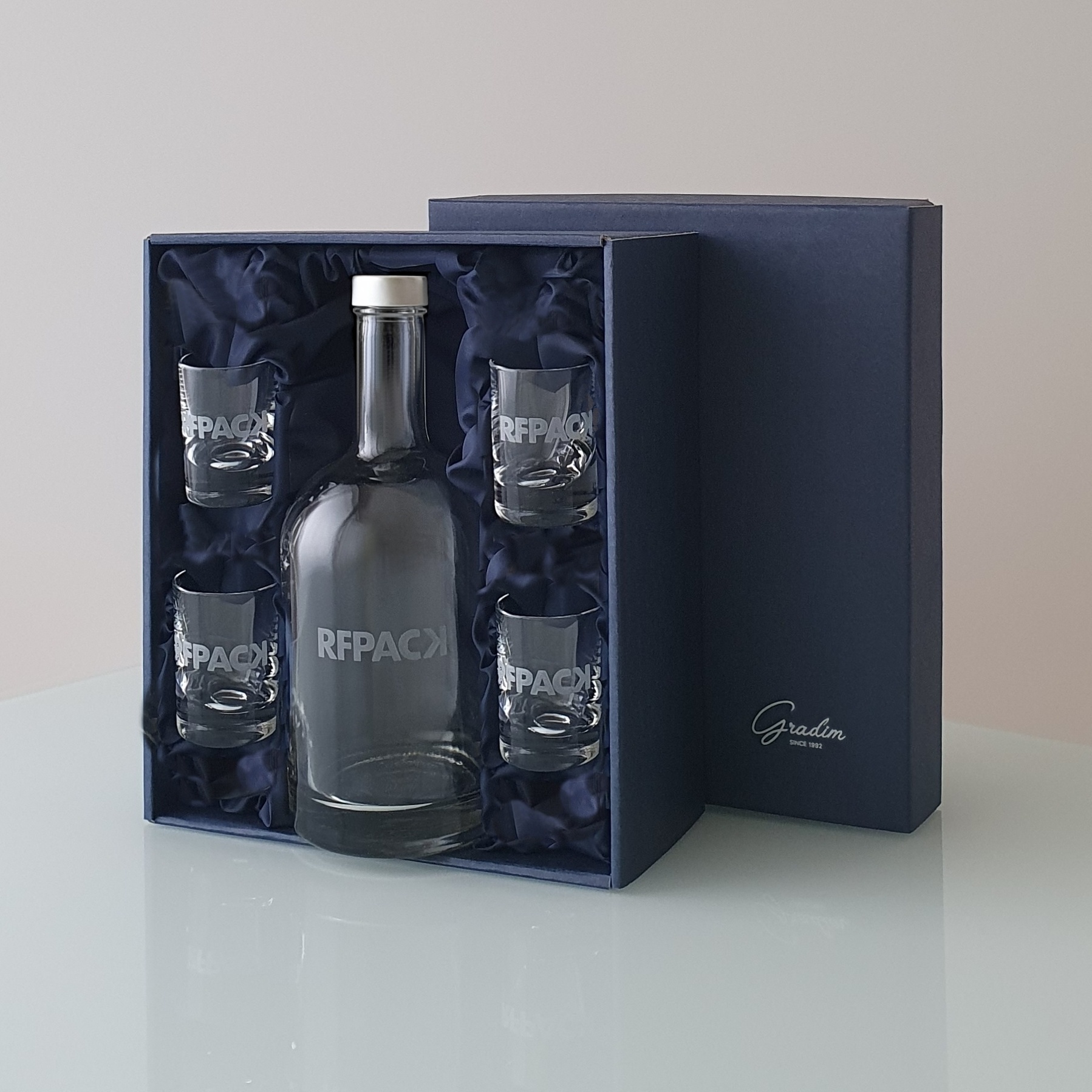 Firemní dárková saténová kazeta obsahuje láhev o objemu 500 ml a 4 ks sklenic o objemu 30 ml s vygravírovaným nebo vypískovaným logem. Cena je včetně gravírování a saténové dárkové kazety a platí při odběru od 30 ks. Pro možnost ověření dostupnosti zvoleného produktu zvolte způsob platby převodem na bankovní účet.