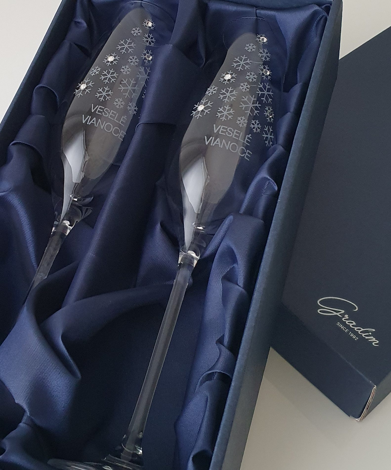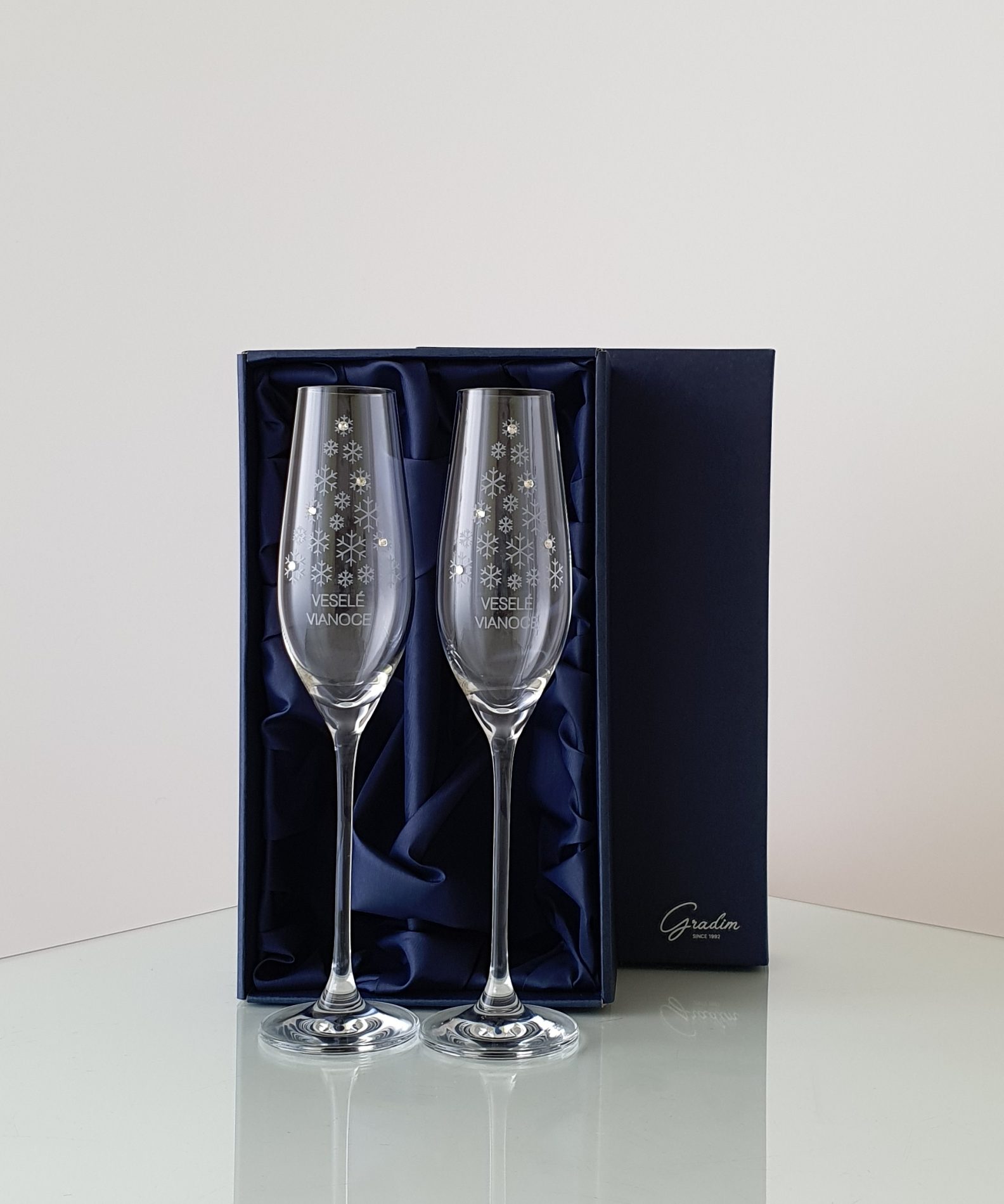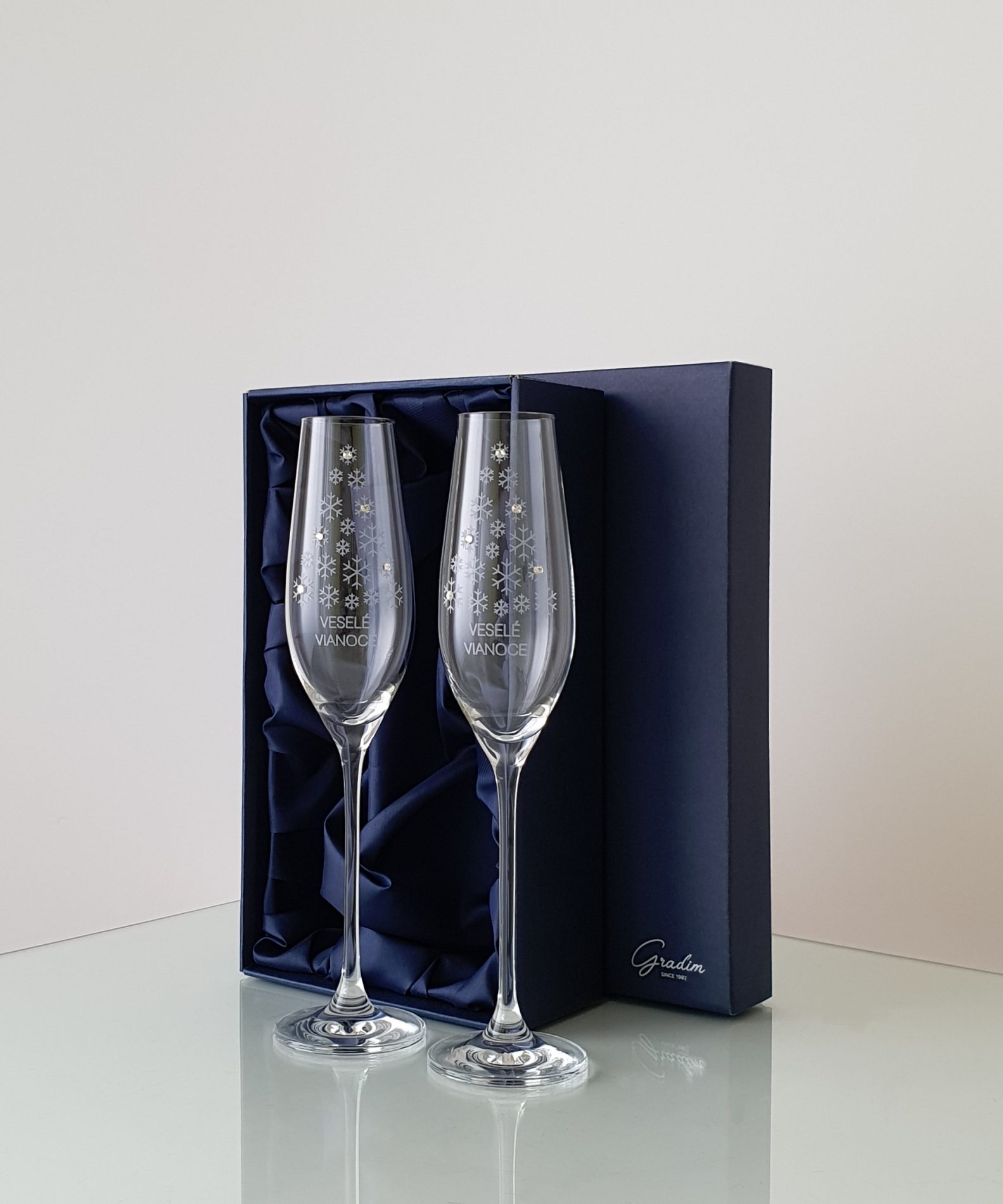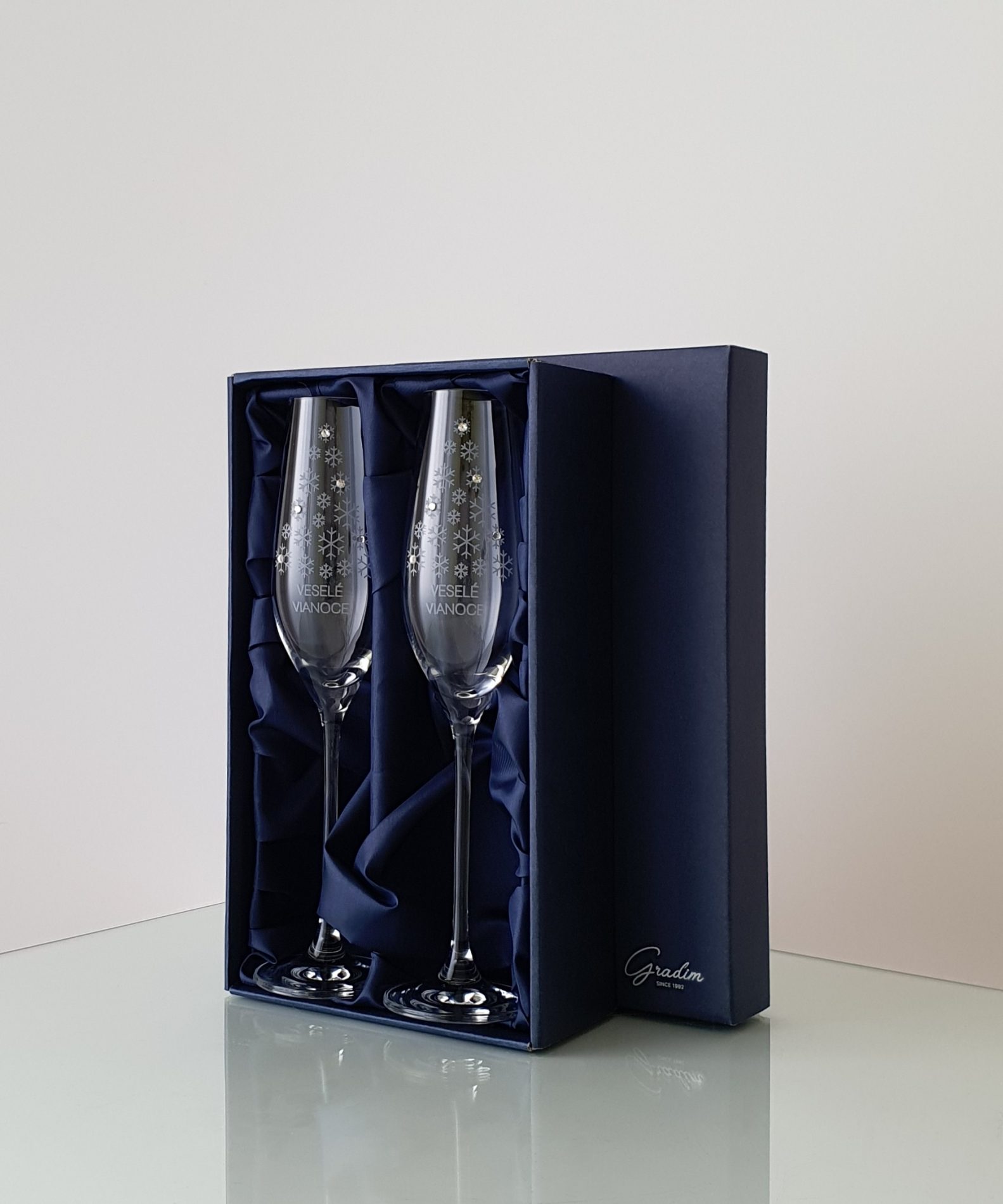 Dárková kazeta z kolekce Veselé Vánoce obsahuje 2 sklenice na šampaňské o objemu 210 ml, zdobené originálními krystaly Swarovski® crystals. Cena je včetně gravírování a dárkové saténové kazety. Možnost doobjednat z druhé strany vánoční věnování resp. pískování loga nebo pískování stopky. Pro možnost ověření dostupnosti zvoleného produktu zvolte způsob platby převodem na bankovní účet.