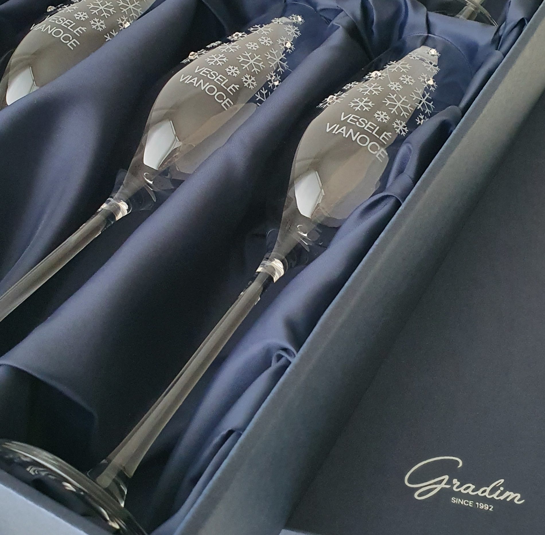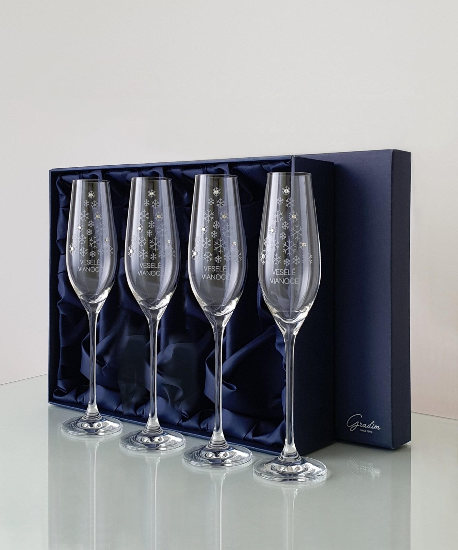 Dárková kazeta z kolekce Veselé Vánoce obsahuje 4 sklenice na šampaňské ml , zdobené originál krystaly Swarovski® crystals. Cena je včetně gravírování</strong dárkovésaténové kazety. Možnost doobjednat z druhé stranyVánoční věnování resp.pískování loga nebo pískování stopky. Pro možnost ověřenídostupnosti zvoleného produktu, zvolte způsob platby převodem na bankovní účet.