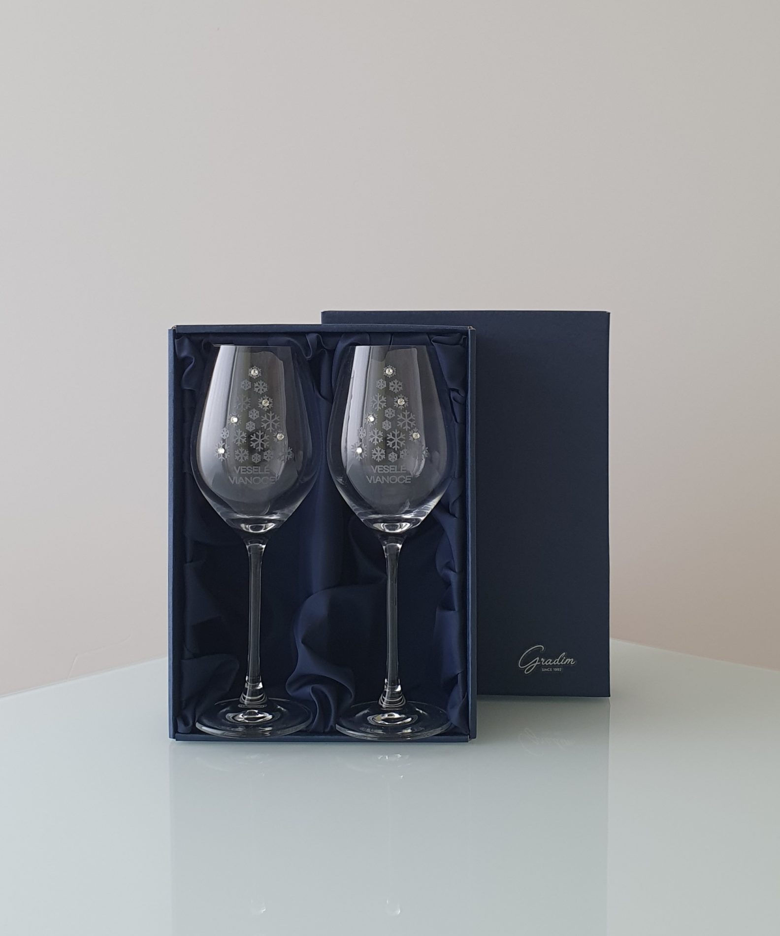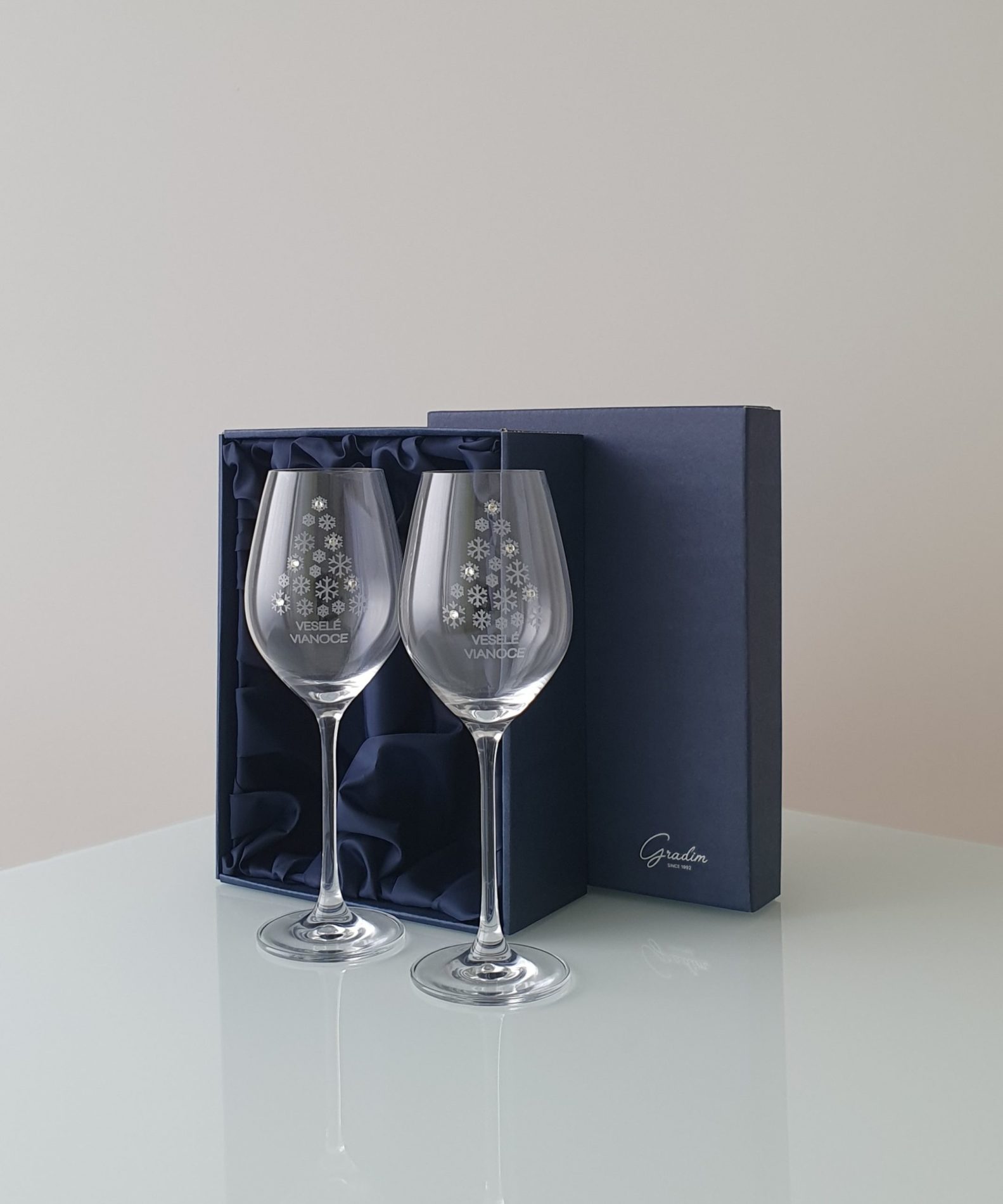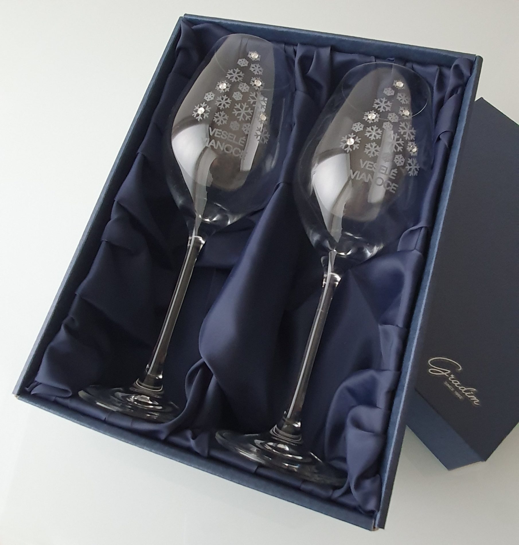 Dárková kazeta z kolekce Veselé Vánoce obsahuje 2 sklenice na víno o objemu 360 ml, zdobené originálními krystaly Swarovski® crystals. Cena je včetně gravírování a dárkové saténové kazety. Možnost doobjednat z druhé strany vánoční věnování resp. pískování loga nebo pískování stopky. Pro možnost ověření dostupnosti zvoleného produktu zvolte způsob platby převodem na bankovní účet.